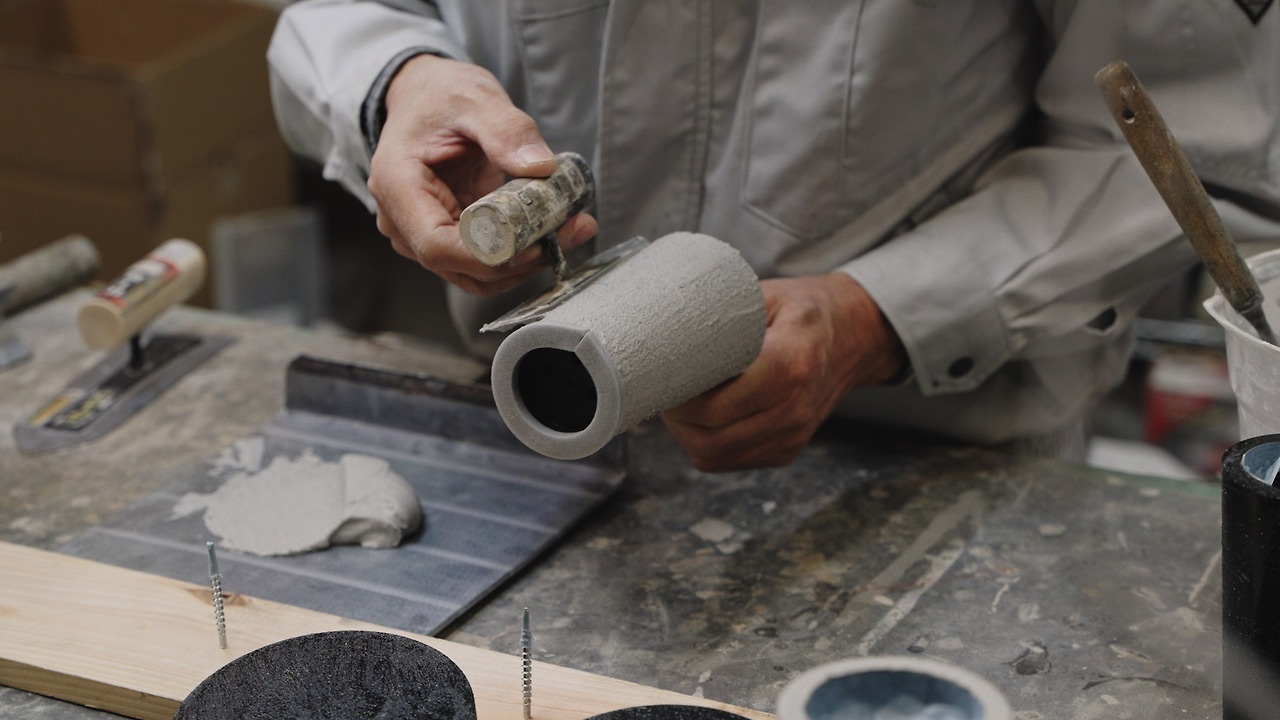 스튜디오는 도쿄 전역의 건설 현장을 방문해 재사용 가능성과 재활용 가능성에 따라 잔해와 파편을 수거했다. 이 폐기물은 분말로 갈아지고, 녹은 유리가 접착제 역할을 했다.