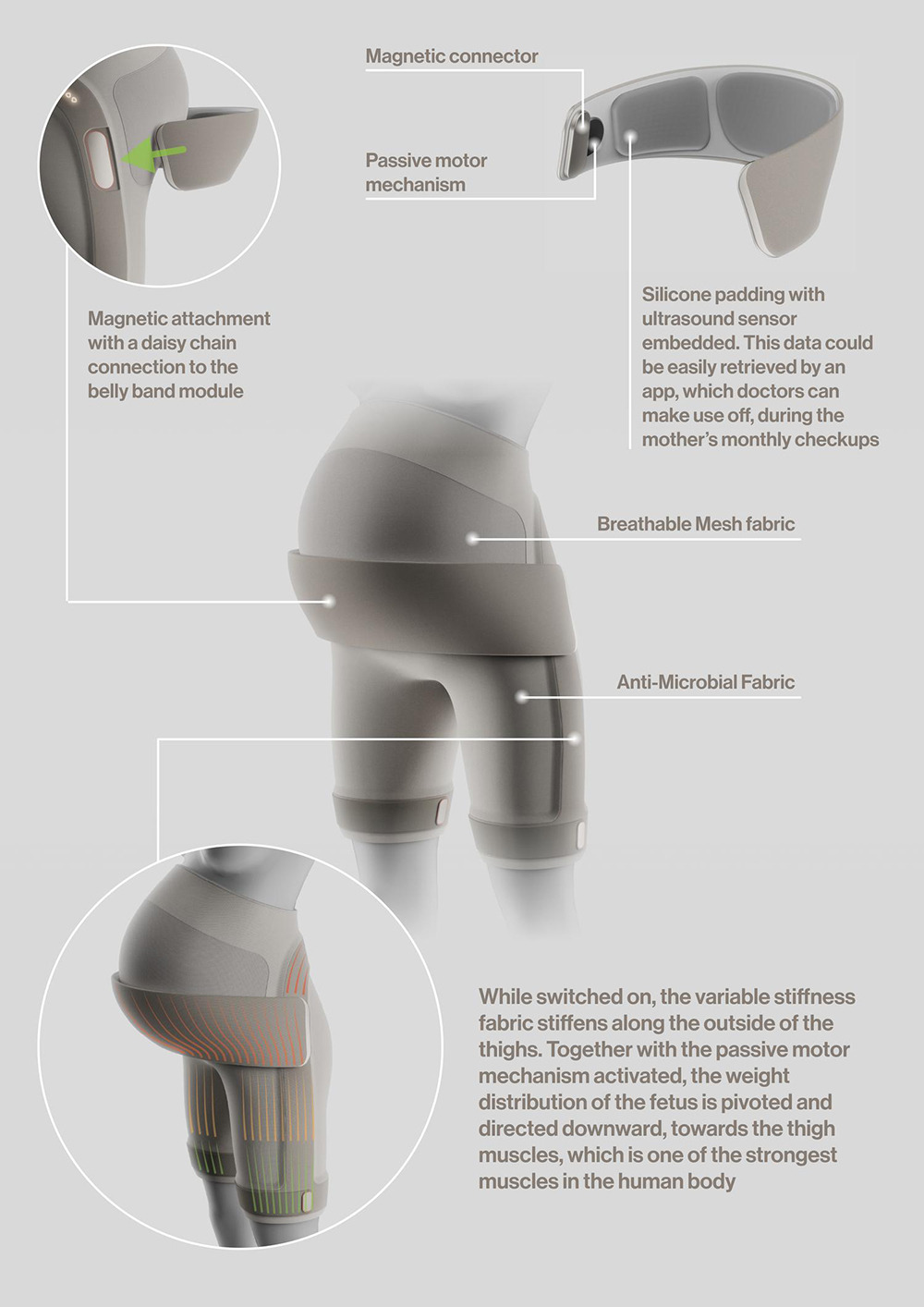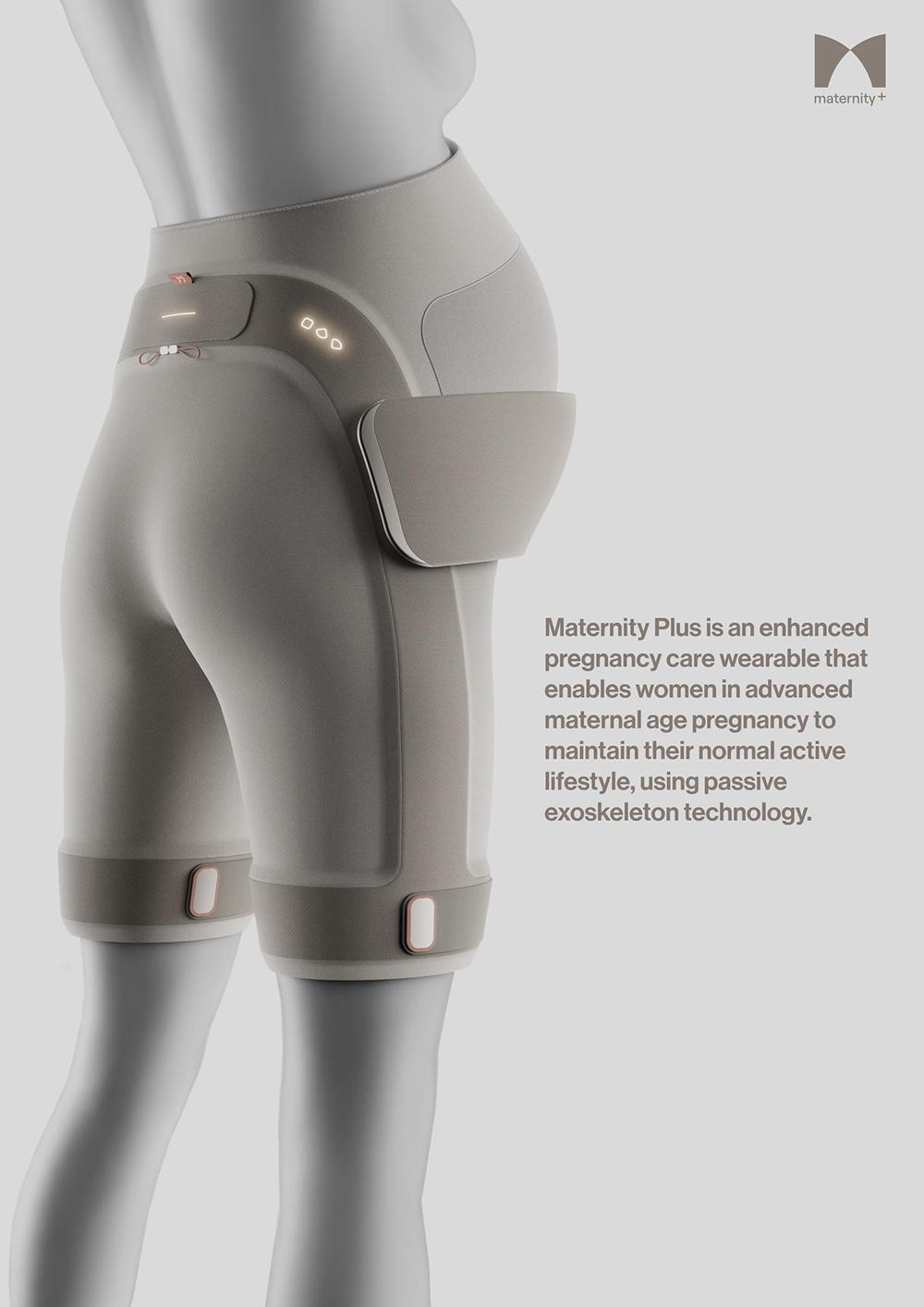 싱가포르국립대학 로보틱스랩과 협업으로 디자인한 마터니티플러스는 임산부의 복부를 안정적으로 받쳐주며, 일상의 활동을 불편함 없이 수행할 수 있도록 돕는 보조기구이다. 몸의 앞쪽으로 중심이 쏠려서 생기는 사고와 불편함을 줄이기 위해, 몸에서 가장 근육이 발달한 허벅지 뒤쪽으로 배의 무게를 분배한다. 일상 초음파 기능으로 부모가 태아의 성장 상태를 상시 모니터링할 수 있고, 의사 역시 산모의 꼼꼼한 건강 기록을 바탕으로 공백 없는 의료 지원을 할 수 있다.