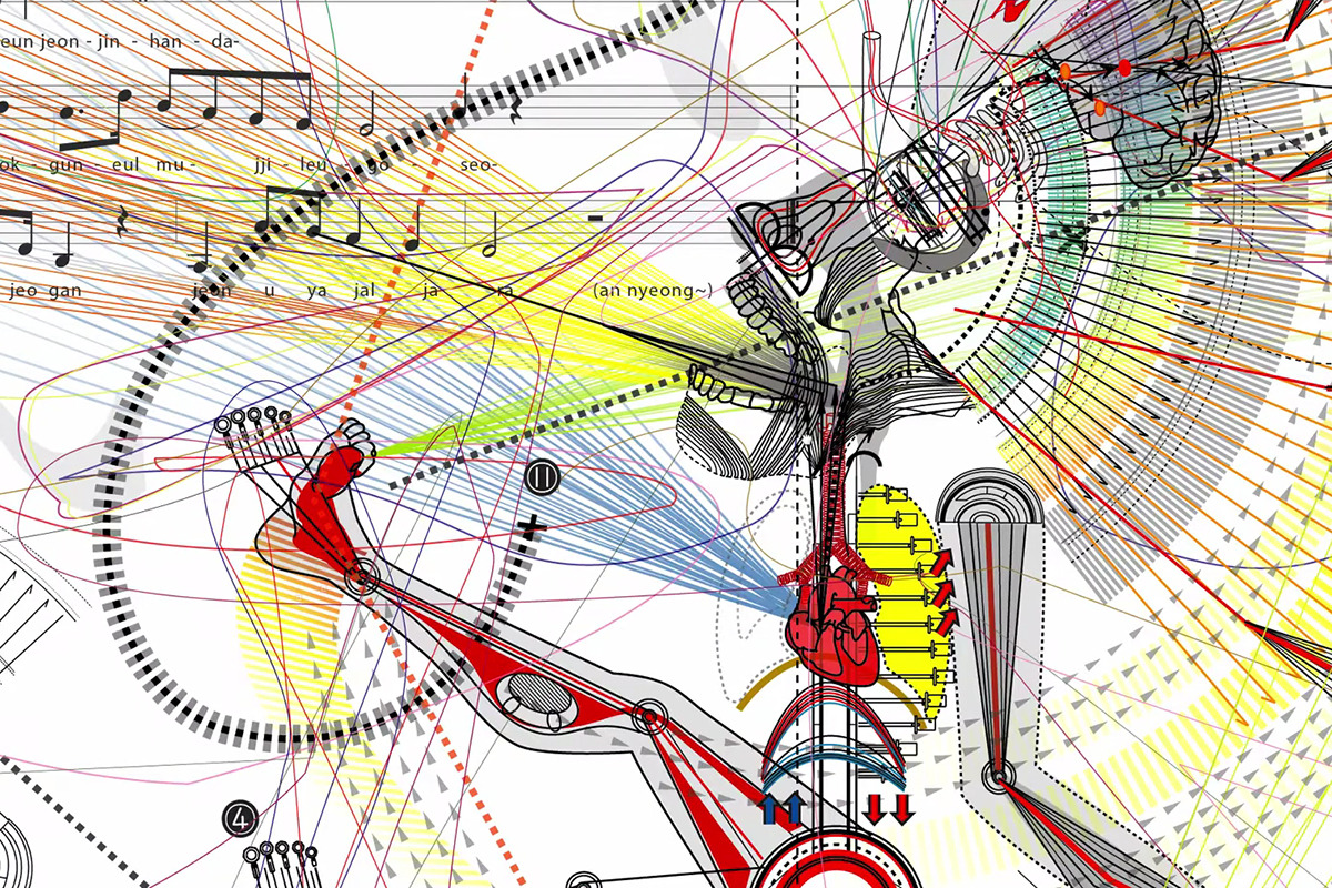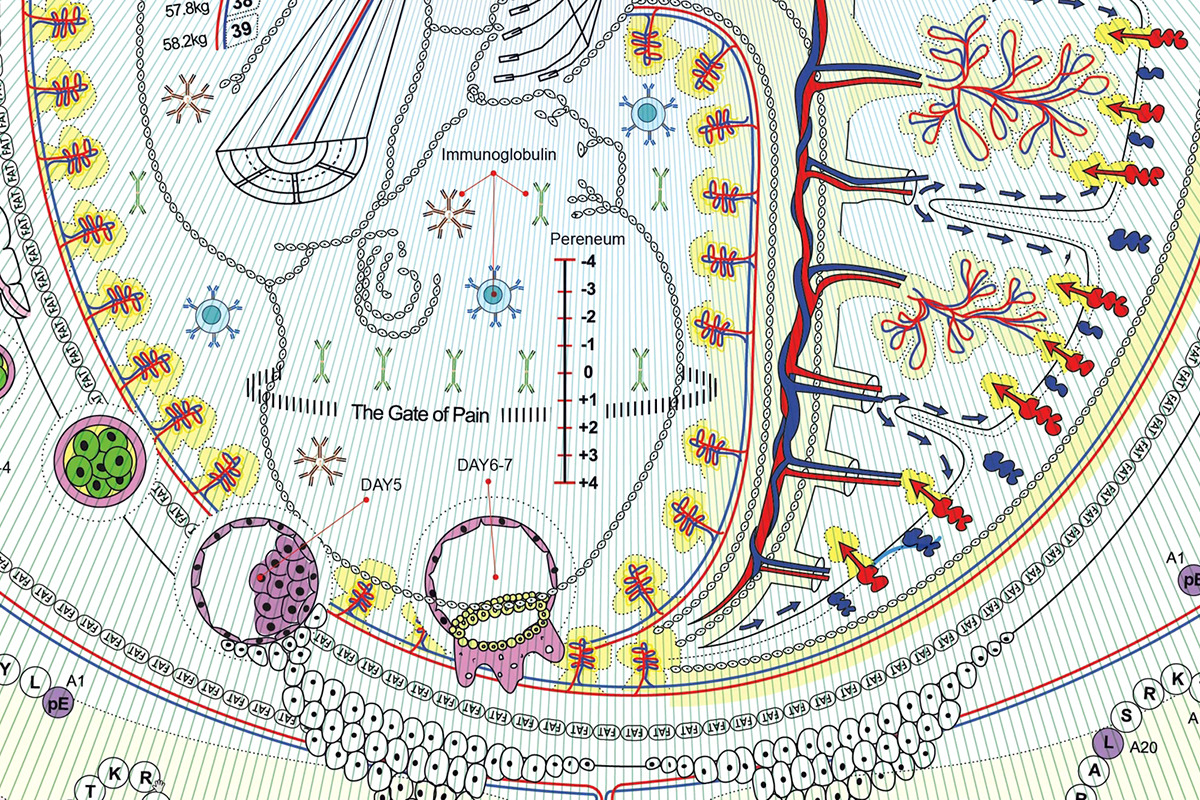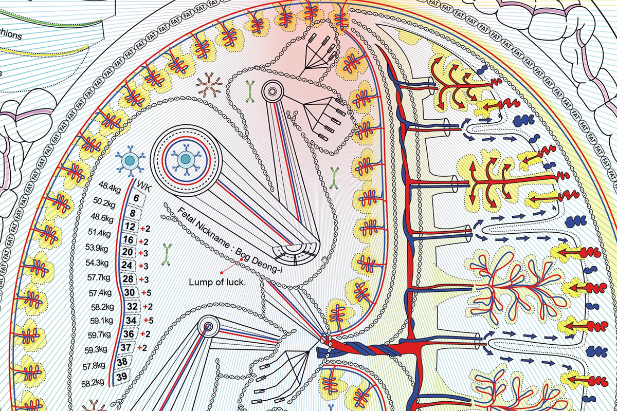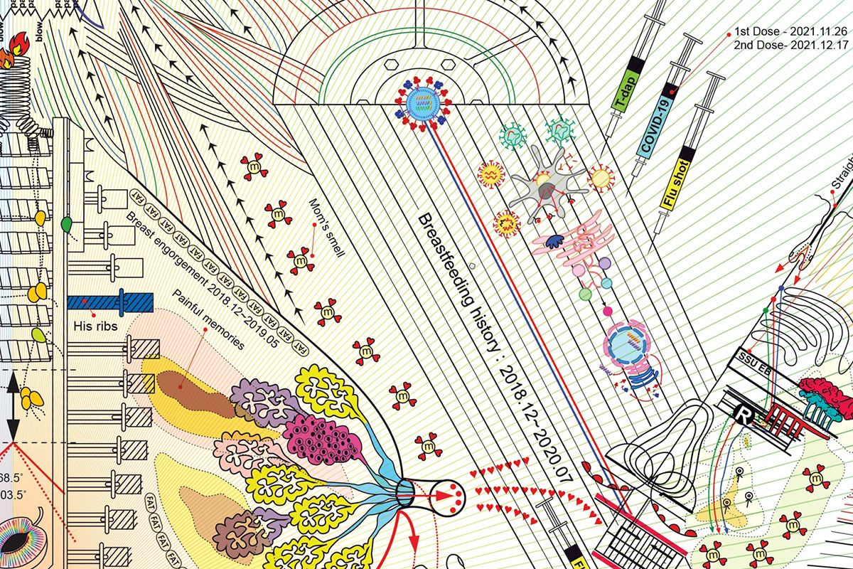 얼마 전, 작품 ‘자화상-라하프(Self-Portrait-Rachaph, 2024)’는 국제적으로 주목 받으며, 뉴욕현대미술관(MOMA)에 영구 소장되었다. 2007년에 자화상이라는 제목으로 신체를 해부도처럼 해석한 작품 이후, 2024년에는 아이 둘을 출산한 후 몸의 변화와 출산, 가족, 모성, 관계 기억 등 삶의 경험을 반영한 작품을 제작했다. Rachaph는 히브리어로 ‘보호하다, 알을 품다’라는 의미로 가족을 사랑하는 마음, 보호하는 마음을 예술로 표현했다. 작가의 몸은 가족의 지도가 되어, 모성애를 전자 회로도와 융합해 자신만의 초상화를 그렸다. 모유 수유, 거꾸로 누워있는 배 속 아이의 모습, 출산 후 오른팔이 된 남편, 왼팔에는 항상 엄마 곁에 있는 첫째 딸을, 배 속에는 아직 태어나지 않은 둘째 딸을 표현했다. 엄마가 된 후 변화한 머리카락과 백신 주사로 인한 불안감을 표현하거나, 한글 발음을 그대로 영어로 표기하여 남편과의 대화 내용을 유머러스하게 표현하면서, 자신만의 이야기를 전달한다.