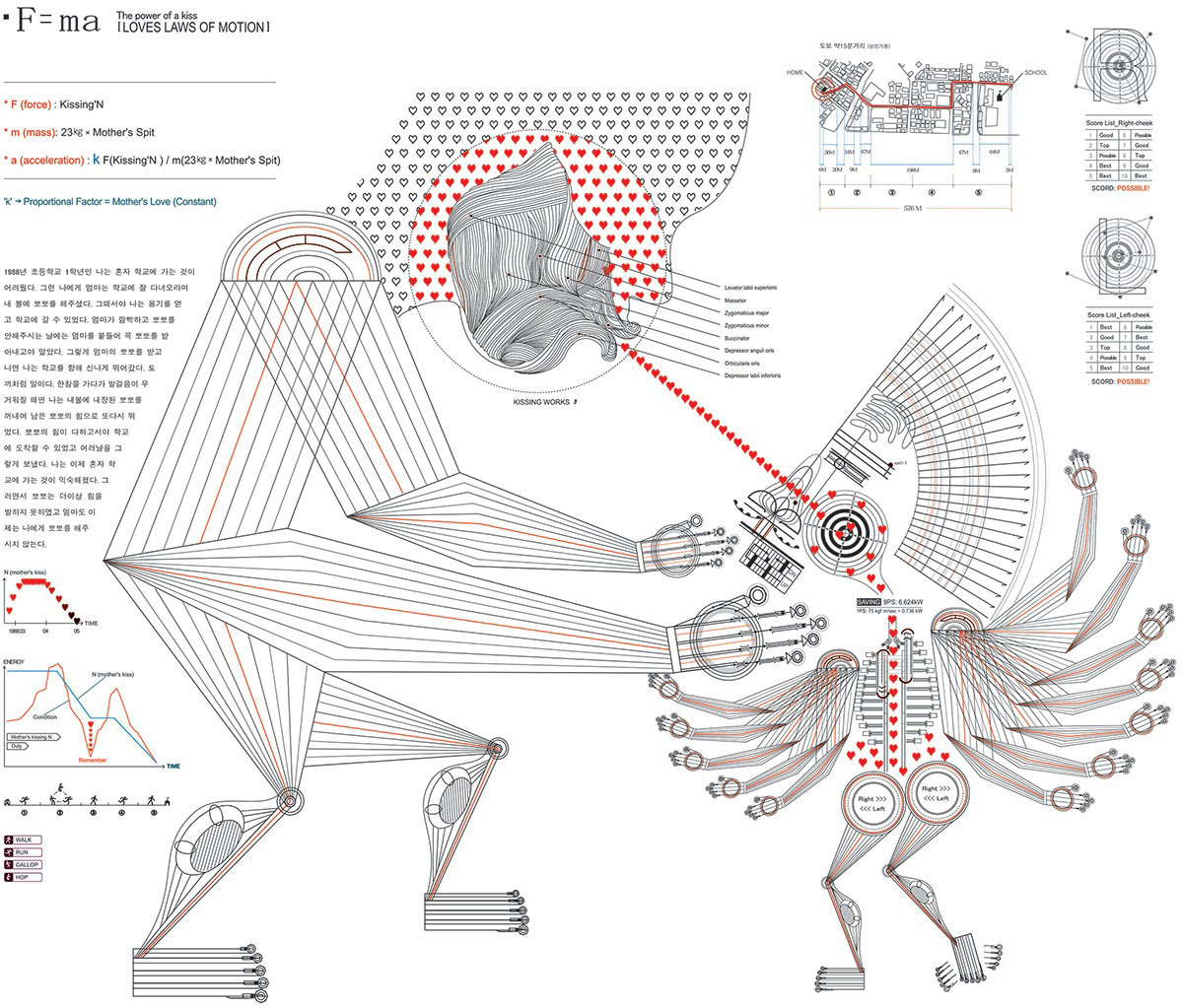 또 다른 작품 ‘뽀뽀의 힘(The Power of a Kiss, 2008)’은 작가의 작업 방식을 가장 잘 보여주는 대표작이자, 작가가 특히 애정을 갖는 작품이다. 작가는 초등학교 1학년 시절, 혼자 학교에 가는 길이 두려웠었는데, 그때 어머니가 학교에 잘 다녀오라며 볼에 뽀뽀해 주어야 용기를 얻고 학교에 갈 수 있었다고 한다. 작가는 이러한 뽀뽀의 힘을 ‘뉴턴의 운동 제2법칙 F(힘)=ma(질량 x 가속도)’에 대입해서 표현했다. 물리학적 공식이라는 객관적 언어를 빌려, 인간을 움직이게 하는 힘이 단순한 열량이나 물리적 에너지에만 있지 않음을 드러낸다. 엄마의 뽀뽀처럼 보이지 않는 감성과 애정 역시 앞으로 나아가게 하는 강력한 원동력임을 보여주고자 했다. 이 작품은 개인적 기억을 과학적 구조로 전환함으로써, 감정의 힘으로 보편적 언어로 확장하는 작가의 작업 세계를 상징적으로 담아낸다.