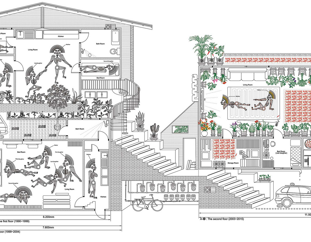 ‘우리 집 세부도(Detailed Map of My House, 2015)’에는 작가가 35년 동안 한 다가구주택에서 이사를 거듭해 온 가족의 역사를 담은 작품이다. 작품 속 A-1부터 A-4까지의 표기는 1981년 작가의 출생 이후 거주 공간의 변화를 시간순으로 보여준다. A-1은 부모님과 네 자매, 친할머니까지 일곱 명이 살던 작은 단칸방이며, A-2는 형편이 조금 나아져 옆의 조금 더 넓은 방으로 옮긴 때를 나타낸다. A-3은 3층에 새로 지은 집으로, 대학교 기숙사에서 살게 된 큰 언니를 제외한 다섯 식구가 함께 살던 공간이다. A-4는 자녀들이 모두 독립한 뒤 부모님 두 분만 넓은 2층 집에 거주하는 현재의 모습을 그렸다. 식물을 키우고, 비어 있는 거실과 방에는 겨울 김장을 위한 붉은 고추가 바닥을 채우고 있는 모습을 표현했다.