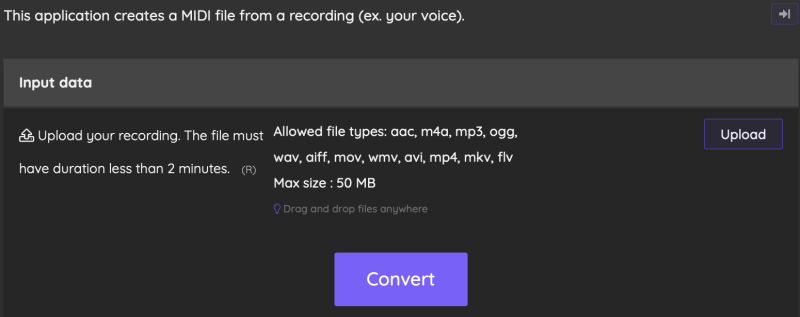 사용 방법은 굉장히 단순합니다. 사이트에 접속한 뒤 Upload 단추를 누르고 컴퓨터에 있는 음악 파일을 가져오고 업로드가 완료되면 보라색 Convert 단추를 누르기만 하면 되죠😊